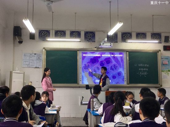 2017年10月24日,重庆11中高2018级以党的十九大新思想为指引,以青年教师“先学后导,学导结合”的课堂模式展示课活动热烈庆祝党的十九大胜利闭幕。生物组邬杉杉老师携高2018级21班全体同学,以《细胞的增殖——有丝分裂》为主题为老师们带来了一堂精彩的示范课。