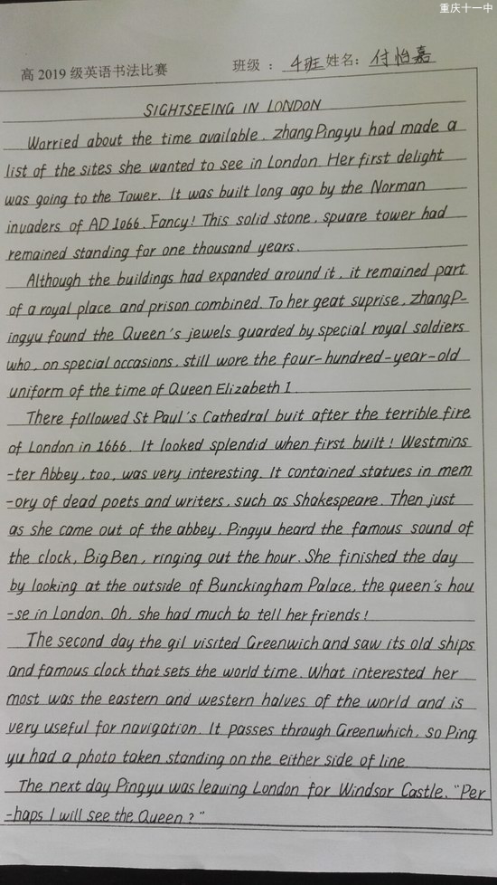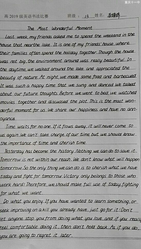 五一节期间,高2019级英语备课组组织全年级同学开展了“we are what we read”大阅读活动系列活动之英语书法比赛。同学们趁劳动节放假期间,自行选取感兴趣的内容进行书写,节后上交书法作品,先进行班级评比,再推荐优秀作品参与年级评比。