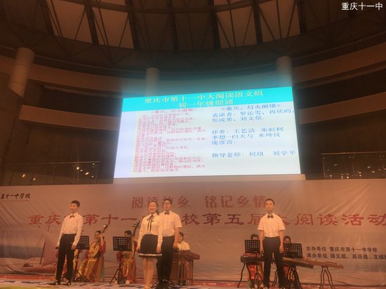 如果不阅读,所有的世界,都得自己去走一遍,所有的历史,都只能从别人口中去听说。世界太大历史太长而生命太短,感谢阅读让我们的思想驰骋。5月3日重庆第十一中学校“我的重庆我的梦”大阅读活动之初中年级动态展示活动在初一语文张雪静老师深情朗诵的“廪君传说”中正式拉开帷幕。