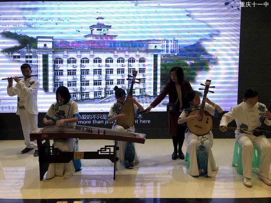 在我们十一中的展台前,二胡、笛子、琵琶、中阮、扬琴、古筝的琴瑟和