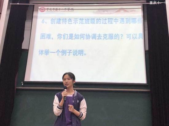 2019年5月27日下午,重庆市第十一中学,高2021级班级文化建设示范班级答辩会在多媒体教室如火如荼的举行着。出席本次答辩会的领导有学校副校长肖开模校长、德育处主任刘运超主任、年级主任毛阿英主任、年级所有班主任和班长、以及1班和4班全体同学。