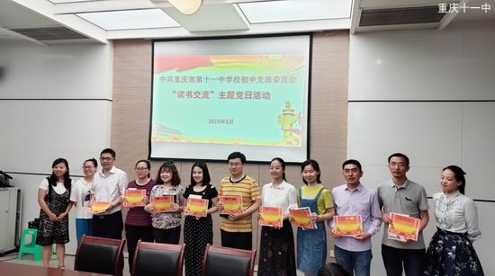 2019年5月23日下午4点55,中共重庆市第十一中学校初中支委党员大会在学校圆桌会议室召开,会议共分为三大流程,一是表彰党员读书先进个人,二是学习党的相关条例,三是聆听每个年级的党员教师深度交流自己的读书心得,会议由雷小利老师主持。