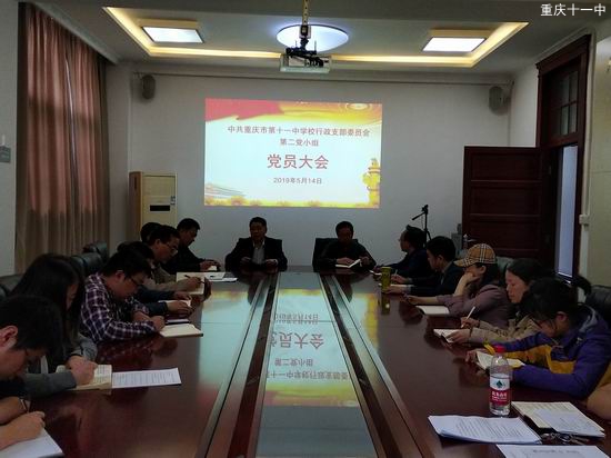 2019年5月14日下午,中共重庆十一中行政支部委员会第二党小组在校本部精益楼会议室召开党员大会,认真学习《理论知识100题》。