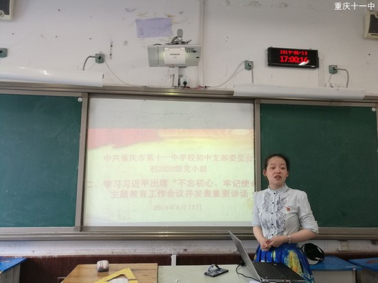 2019年6月13日下午第四节课(16:55分),中共重庆市第十一中学校初中支部委员会初2020级党小组全体党员在修德楼406教室召开党员大会,集中进行思想政治。会议的主要学习内容为:第一、学习《中国共产党党员教育管理工作条例》;第二、学习习近平总书记出席“不忘初心、牢记使命”主题教育工作会议的重要讲话精神;第三、观看任正非央视专访。