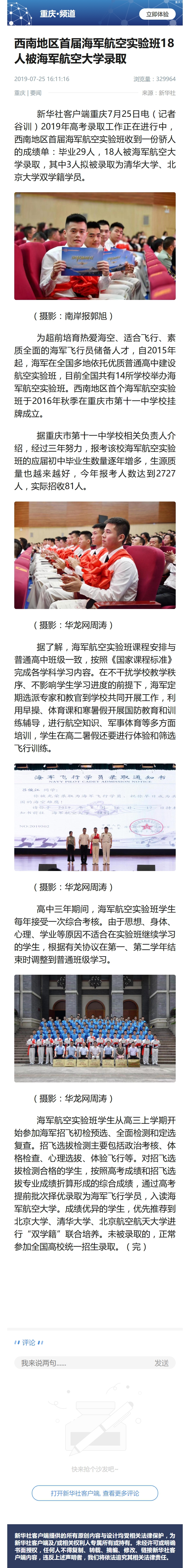 【新华社】西南地区首届海军航空实验班18人被海军航空大学录取