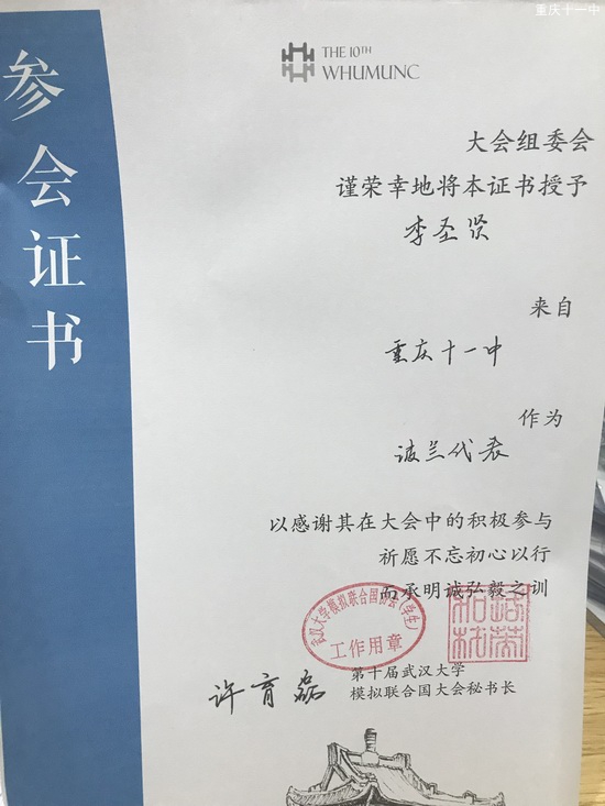 本次模联完美落幕,重庆市第十一中学校的代表们纷纷表示,模拟联合国大会提高了自身的参政意识、政治意识,作为中学生的自己也切身体会到了国际社会错综复杂的形势,这次武大模联之行也为以后的参会积攒了宝贵的经验。
