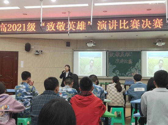 高2021级11班选手杨曜萌同学在本次比赛中夺得第一,赢得一致好评,其演讲题目为“致敬英雄,呼唤脊梁”,全篇讲述了于敏、申纪兰两位共和国勋章获得者的感人事迹,称赞她们为中国的英雄,民族的脊梁。深刻动人的阐释了她对于“中国的英雄,民族的脊梁”的独特见解,并积极号召吾辈青年学子,像英雄学习,争当“精神的脊梁”。