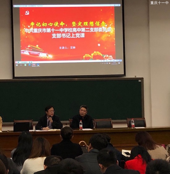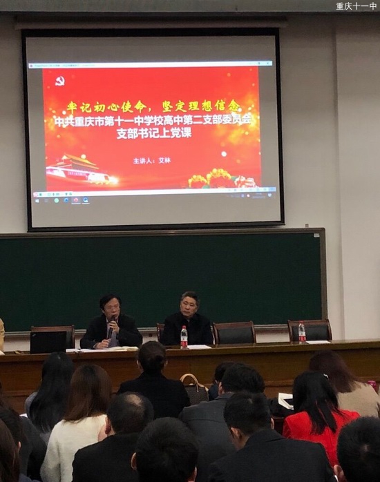 2019年11月11日下午6点,在重庆市第十一中学校CBD校区会议室里,高中第二支部委员会书记艾林同志结合个人自主学习与集中培训体会给支部全体党员同志上了一堂以“牢记初心使命,坚定理想信念” 为题目的党课,学校党委书记钟进友同志、教师发展中心负责人许刚强同志到会指导。