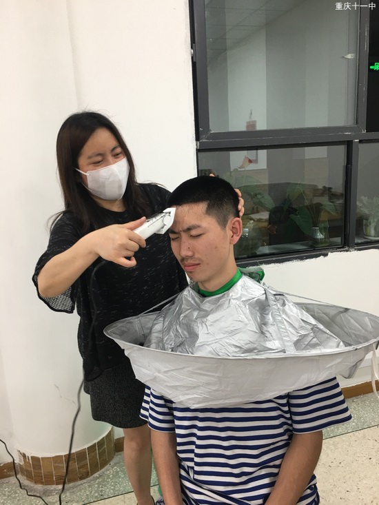 疫情防控期间,为了降低聚集性感染的风险,学校海航部决定高2021级和高2022级四个海航班进行为期三天的、有一定安全距离的体能训练。5月2日晚,毛阿英主任走进海航班,化身为理发师给海航学子理发。理完发后,一个个小伙子精神抖擞,军人的那种干练和那股拼劲儿在他们身上展现得淋漓尽致。