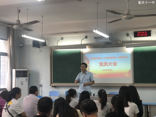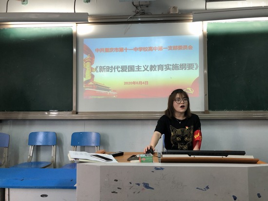 6月4日下午,重庆市第十一中学校高中第一党支部在修德楼五楼会议室召开主题为新时代爱国主义教育的党员大会。会议由党支部书记梁龙全与宣传委员余飞扬老师主持,对在坐的全体党员进行了深入、持久、生动的爱国主义教育。