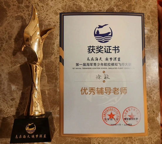 涂敏老师巾帼不让须眉,带领团队从全国十三所海军青少年航校中脱颖而出,成绩斐然,个人荣获“优秀辅导教师”称号!