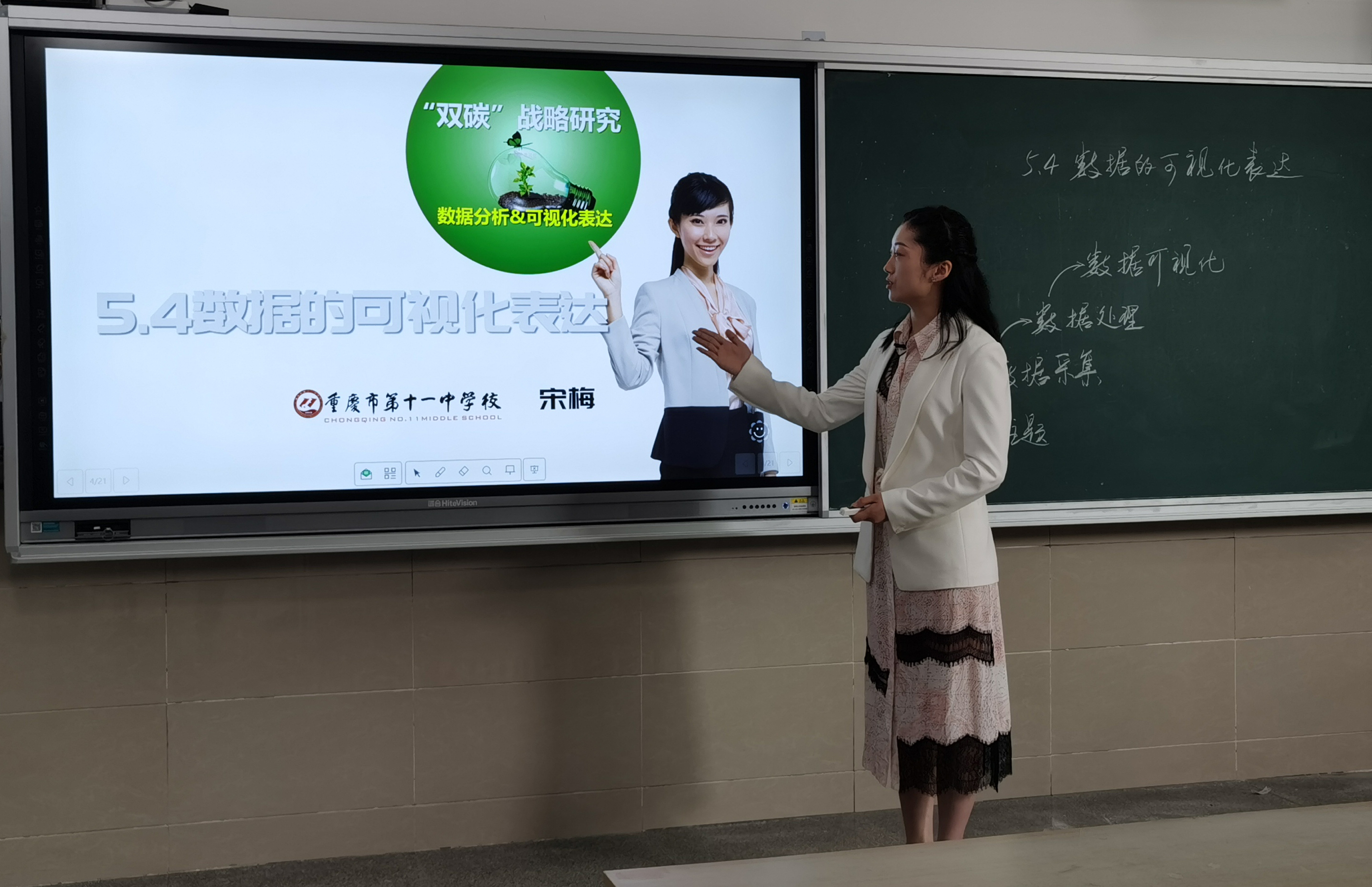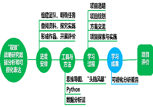 宋梅老师此次赛课的课题为《5.4 数据的可视化表达》,本课程采用大单元设计,贯穿“‘双碳’战略研究数据分析和可视化表达”的项目,整个项目预计5个课时,本节是第4课时。