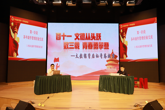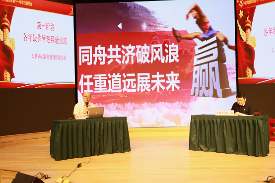 高二年级童国福主任以“勠力中流击水,献礼百十华诞”为汇报主题,从党建解决方向问题、德育解决团建问题、教学解决实效问题、反思建设解决深度问题、新高三预备工作等方面进行了深度剖析。