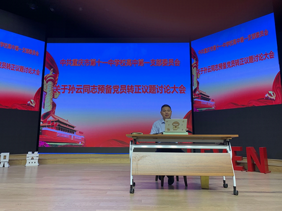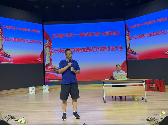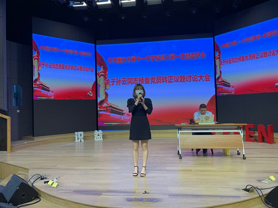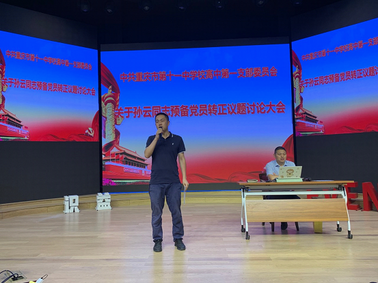 然后,入党介绍人刘世军和余飞扬同志分别介绍了孙云同志在预备期的培养考察情况。孙云同志工作中大局观念强、踏实肯干、教学有方,全心全意为学生和家长解决问题,和学生交流其乐融融,和家长沟通默契,和同事相处融洽。随后,宣传委员张宇霞同志向支部大会报告对预备党员孙云同志的审查情况。