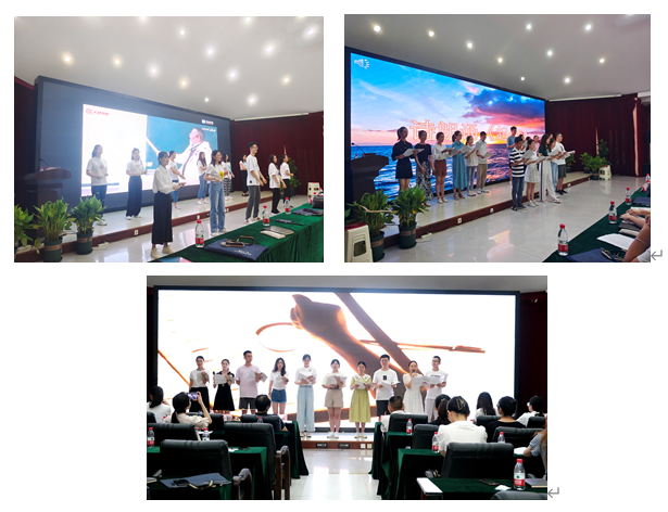 结业仪式的第三项内容,各小组进行汇报表演。第一小组带来配乐诗朗诵《起航》与歌曲合唱《星辰大海》,教师们心怀期待,放眼高远,高呼“十一中,我们来了!”喊出新生力量最强音。第二小组朗诵《师说》,宣誓将紧握教育接力棒,用青春和奋斗诠释:学为人师,行为世范。第三小组表演情景剧《班主任的一天》,重现了教师的日常工作,在歌颂张丽莉老师的歌曲《春暖花开》中谢幕。第四小组以“我爱上课,上课使我快乐”为主题,用幽默风趣的诗歌拼接朗诵融合各个学科特色,引发阵阵欢笑,随后他们带来的舞蹈《教师阵线联盟》更是活泼欢乐,尽显青春本色。