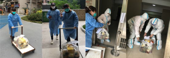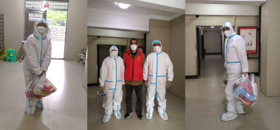 “你好,你订的菜到了,请领取。”疫情期间,物资是否供应充足是人民群众关心的大事。有的志愿者担任了小区的物资配送员。他们先把物资从配送车上卸下,送到楼下,再由负责该栋楼的志愿者一层一层地配送。人们在开门拿取物资的那一刻,与志愿者的相视一笑,传递着暖暖的温情。