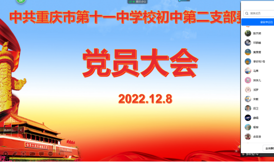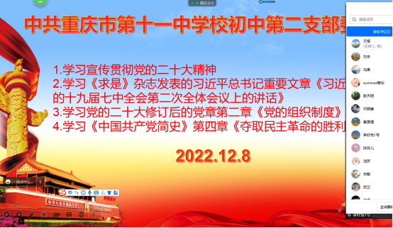 12月8日下午五点,初中第二党支部通过腾讯会议的方式组织全体党员举行十二月主题党日活动,会议由支部书记刘宇主持,初中第二党支部的党员同志参加了此次会议。