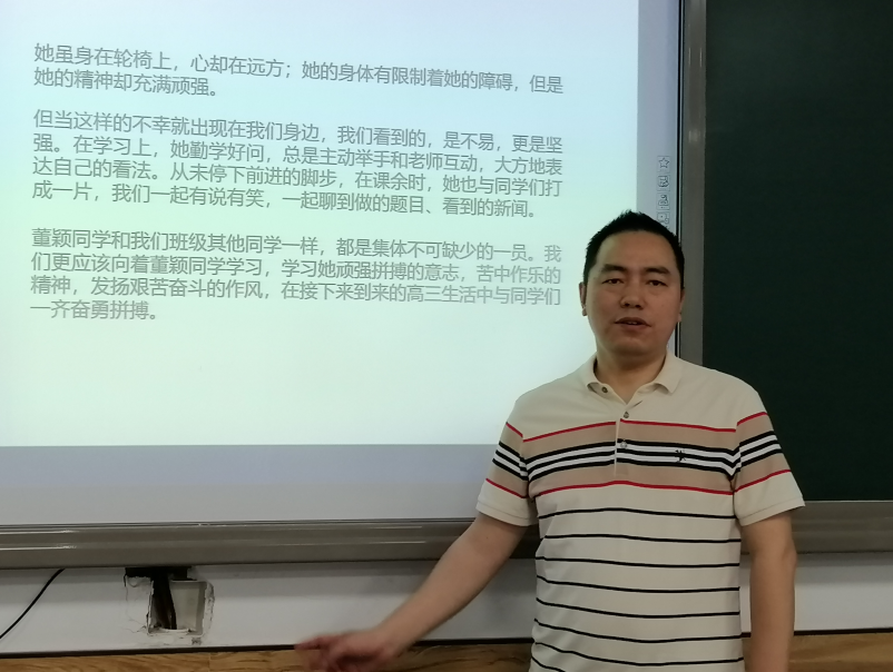 董颖同学和我们班级其他同学一样,都是集体不可缺少的一员。我们更应该向着董颖同学学习,学习她顽强拼搏的意志,苦中作乐的精神,发扬艰苦奋斗的作风,在接下来到来的高三生活中与同学们一齐奋勇拼搏。