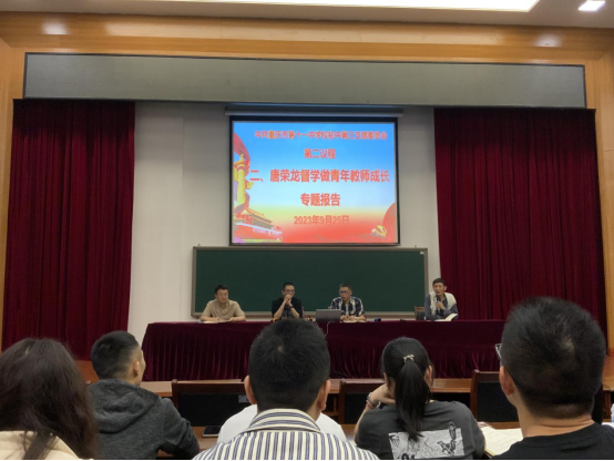 会议的第二项议程由唐荣龙督学作青年教师成长专题报告。他从思想准备和行动落实两方面,结合自己的教学实践为青年教师们提供了诸多思考。其中,在思想准备方面,唐督学寄语了几个关键字“珍惜”“敬业”“钻研”和“奉献”,期望青年教师们能够端正自己的教学态度,以获得更快的成长。在行动落实方面,他用“到哪去”“怎么去”“到了吗”几个通俗易懂的短句为青年教师们深入浅出地诠释了教学目标、过程方法和考核结果的概念和方法。最后,唐督学再次强调了教师成长与学校发展之间相辅相成的关系,为青年教师们的成长表达了美好祝愿。