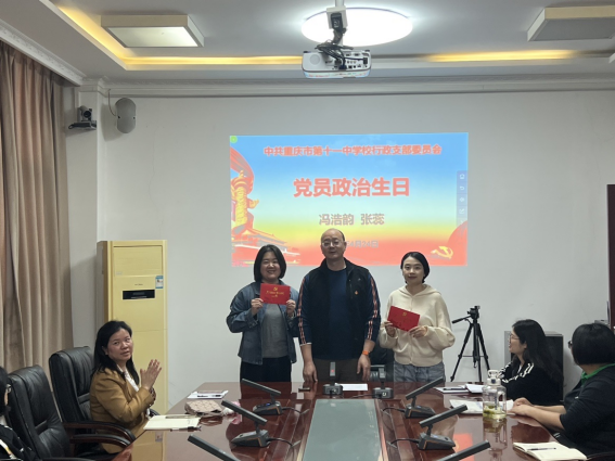会议第二个议题是为支部党员过政治生日。政治生日是党员政治生命的新起点,承载着特殊的意义。党支部书记高勇同志向冯浩韵、张蕊两名同志赠送了政治生日贺卡和学习资料。两名同志表示,自己将不忘初心、牢记使命,为党的教育事业贡献自己的力量。
