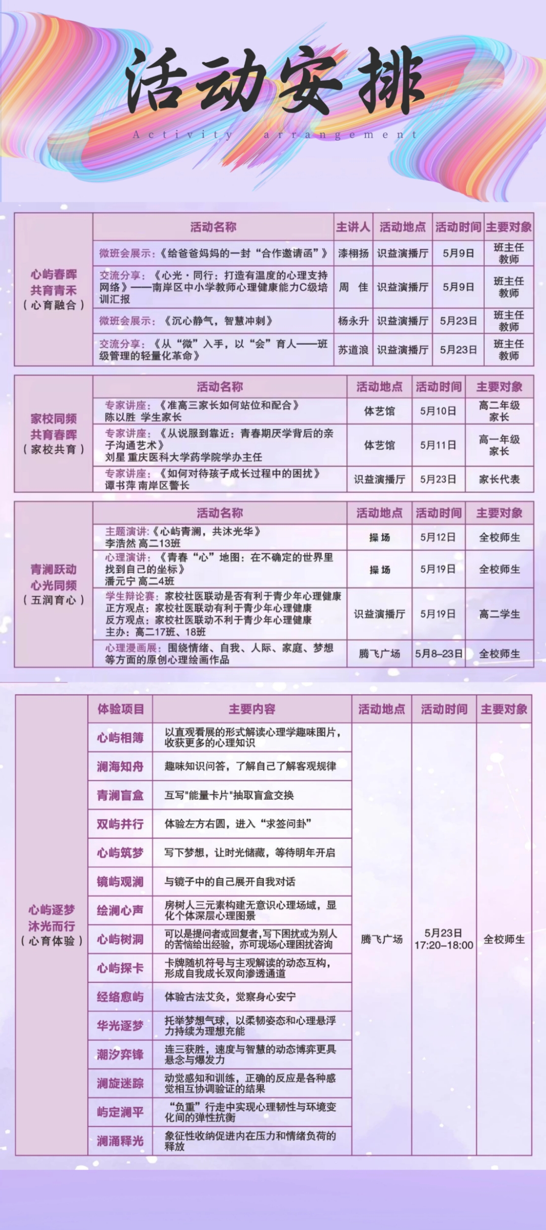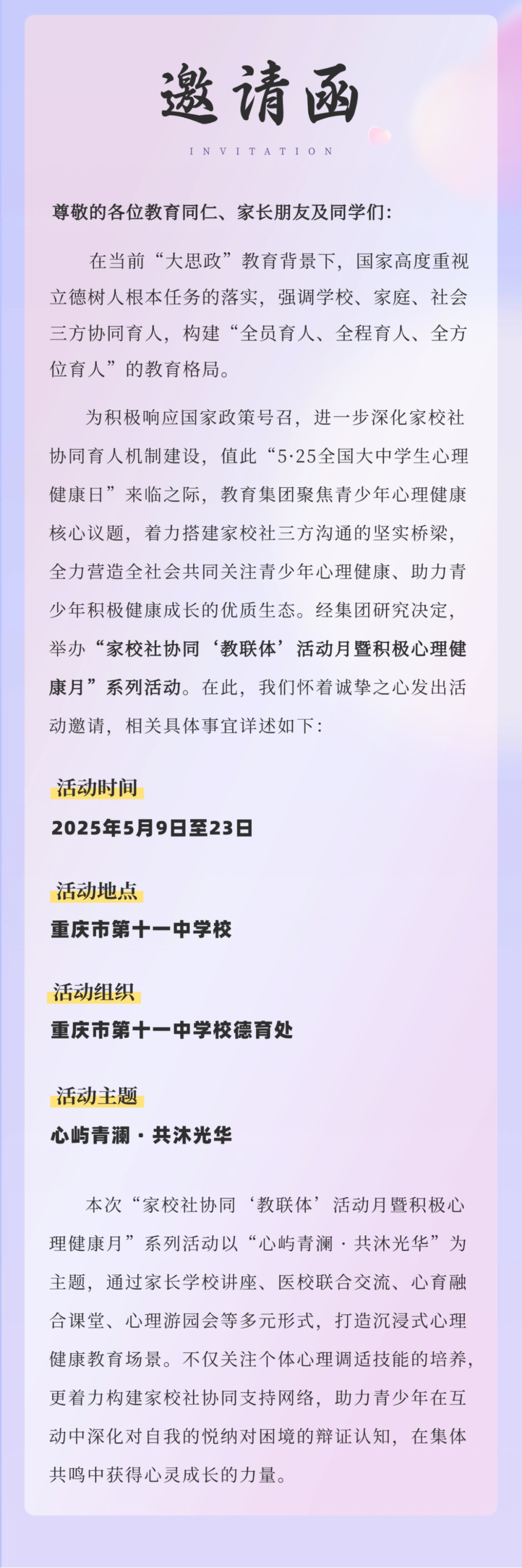 重庆十一中教育集团“心屿青澜 · 共沐光华”家校社协同“教联体”活动月暨积极心理健康月活动