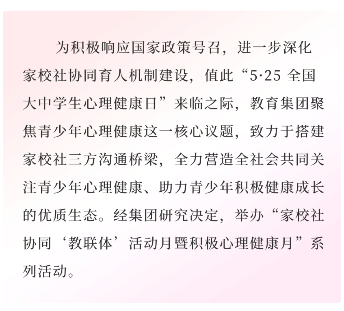 逐梦启征程,沐光绘蓝图,我校将继续深化家校社协同育人机制建设,携手社会各界力量搭建学生心理成长活动平台,为青少年健康成长筑基。