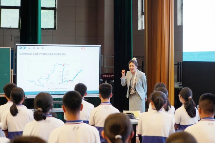 第一节课是成都棠湖外国语学校樊敏老师带来的精彩课堂。她围绕“生态环境与文明发展有何关系”这一问题,以“文明起源→文明发展→智慧治理”为线索,对应“华夏文明的发源地在哪儿”“黄河流域生态环境与人类文明发展的关系”和“人类如何通过智慧治理实现人地协调”三大核心问题,通过设计一系列任务和采用实验探究等方式,引导学生思考探寻“黄河流域的文明发展与智慧治理”这一主题,让学生理解生态兴、文明兴,生态衰、文明衰,人与自然应和谐共生的生态文明价值观。