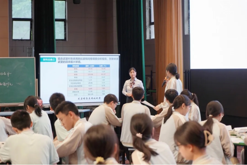 第一节课由我校邓虹老师倾情讲授“农业区位因素的变化”。邓老师宛如一位经验丰富的向导,以武堂村的前世与今生为线索,巧妙地引领学生穿梭于时间的长河。通过传统农业和现代农业的鲜明对比,生动且精准地阐释了农业人文因素的变迁,丝丝入扣地紧扣教学主题。在教学过程中,邓虹老师大胆创新,借助人工智能AI这一神奇的工具,为未来武堂村农业的发展方向与前景绘制出一幅绚丽的蓝图。这不再是抽象的想象,而是将发展愿景具象化,使得“因地制宜、因时制宜和产业融合”这些原本略显晦涩的理念变得清晰可感,让新农村建设那令人欣喜的成果鲜活地展现在每一位师生的眼前。学生们的眼中闪烁着求知的光芒,随着邓老师的讲解积极思考、热烈讨论,仿佛已然置身于未来武堂村那充满希望的田野间。