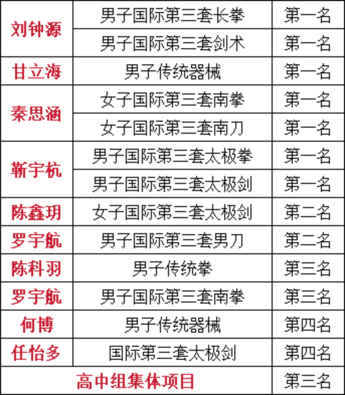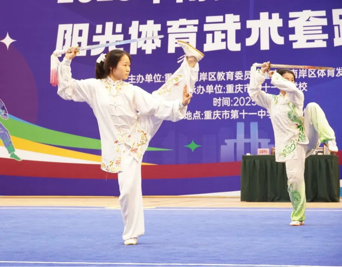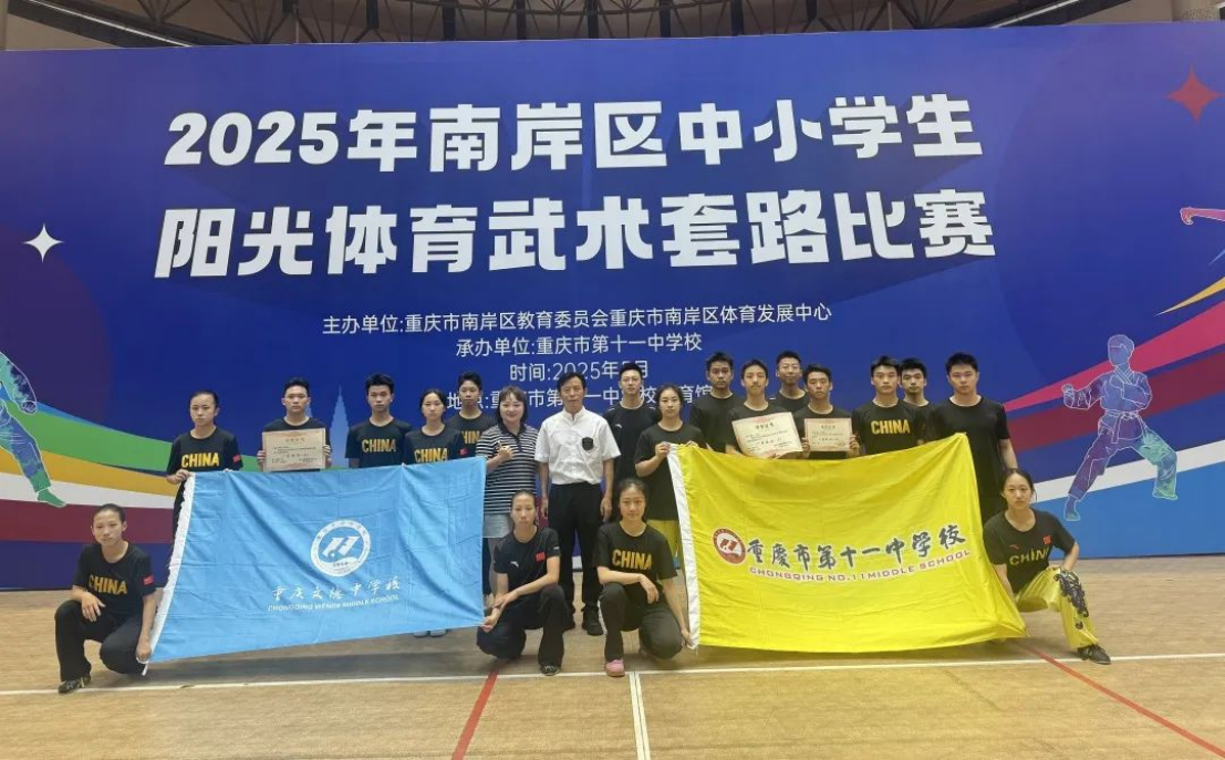 5月27-28日由南岸区教育委员会、南岸区体育发展中心主办的南岸区中小学生阳光体育武术套路比赛中,我校崇德武术队以精湛的技艺和顽强的斗志,在高中组比赛中勇夺团体总分第一名,并斩获11枚金牌、2枚银牌、2枚铜牌。